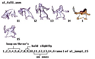 We have more details provided in the sketch for Aladdin’s second falling animation. The image itself calls out specific frames for loops and holds: