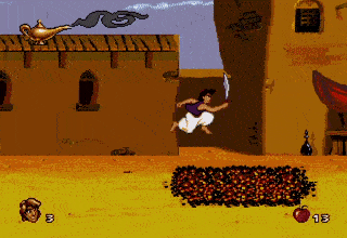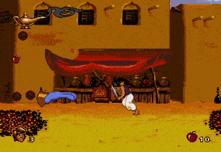 - A man would sometimes appear laying on a bed of nails obstacle in the CD version, allowing Aladdin to jump off of him once without being harmed. After being jumped on once, gets up “in disgust” and can no longer be used as a stepping stone.