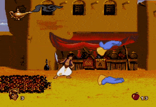 When he retrieves his magic bag, Abu’s reaction/behavior will depend on the number of gems used by Aladdin in defeating the boss. The more gems used, the more angry he will be in his gesticulation. If Aladdin uses no gems, Abu will show his pleasure in some Abu like way. There will probably be three different Abu reactions in the cartridge version (ecstatic, nonchalant and angry) and five in the CD one.
