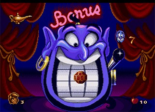 If Aladdin loses, then the game is over and he will be returned to the same spot he left on the map, and will be invincible for a few seconds (this sequences will also occur after the third play of the game regardless of who wins). If Aladdin wins, the screen will show in graphical (as seen if they were being picked up in the regular game) and/or text (if extra score) form, what he has won.